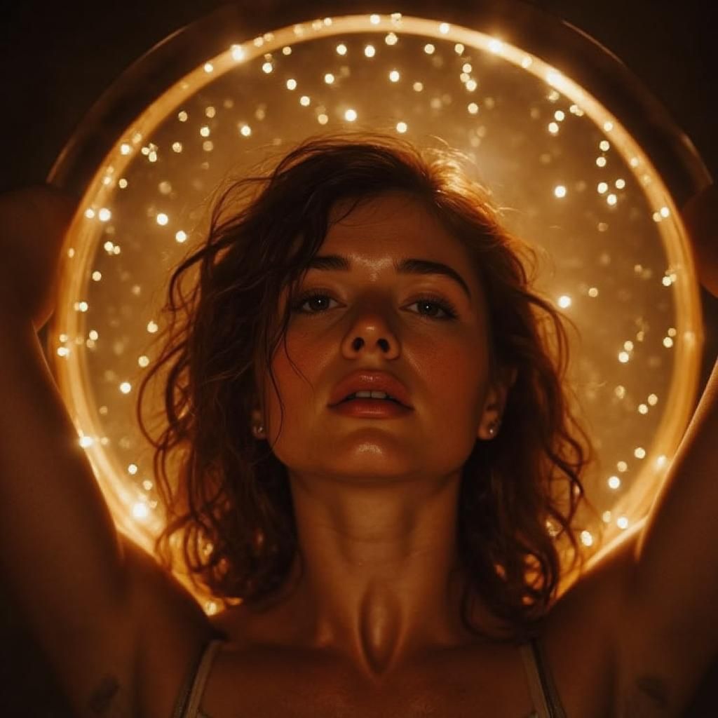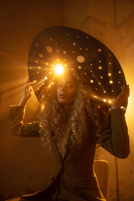 Shot Type: Medium Close-Up. The camera is positioned directly in front of the subject, capturing them from the chest up. This framing allows for a detailed view of the facial features and upper body while still including the full circular disk above. Composition Techniques: The image employs the Rule of Thirds, with the subject's face positioned near the lower-third intersection point. The circular disk creates a strong Framing element, drawing attention to the subject's face. Leading Lines are formed by the light rays emanating from behind the disk, guiding the viewer's eye towards the center of the image. Lighting: The scene is dominated by a warm, golden backlight that appears to originate from behind the perforated disk. This creates a dramatic chiaroscuro effect, with the subject's face partially illuminated and partially in shadow. The backlighting produces a rim light effect around the subject's hair and shoulders, separating them from the background. The perforations in the disk allow beams of light to shine through, creating a starry, celestial effect. Color Palette: The image is dominated by warm tones. Deep, rich golds and ambers are prevalent, contrasted by deep browns and blacks in the shadowed areas. The subject's skin tone appears warm and glowing in the golden light. Mood and Emotion: The scene evokes a sense of mystery and wonder. The subject's expression is calm yet intense, adding to the enigmatic atmosphere. The golden light and celestial imagery create a feeling of transcendence or spiritual awakening. Style: The image has a Cinematic quality, with its dramatic lighting and composed framing. It also incorporates elements of Surrealism in its dreamlike, otherworldly atmosphere. Location and Setting: The setting appears to be an interior space, possibly a studio or a darkened room. The background is indistinct, focusing all attention on the subject and the light play. Character Placement: The subject is positioned centrally in the frame, facing directly towards the camera. Their arms are raised above their head, holding the large perforated disk. The subject's curly hair falls freely around their shoulders and face. Their expression is serene yet intense, with parted lips and a direct gaze towards the camera. The perforated disk is a key element, held above the subject's head like a halo or corona. It appears to be made of a dark material, possibly metal or wood, with numerous circular perforations of varying sizes. The disk is large enough to extend beyond the frame on both sides. The subject is wearing what appears to be a dark-colored, long-sleeved top or jacket. The fabric seems to have a slight sheen, catching highlights from the golden light. The background, while mostly obscured by shadow, hints at angular shapes or corners, suggesting an interior setting. Faint patterns of light and shadow play across these surfaces, likely caused by the light filtering through the perforated disk. The overall effect is one of otherworldly beauty and mystery, with the subject appearing as a celestial or divine figure emerging from darkness into golden light.