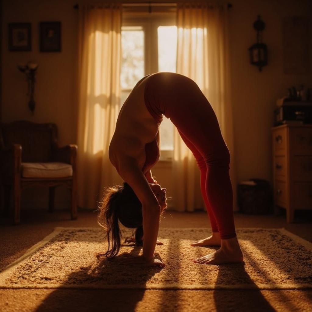 "Create a visually striking medium shot of a figure performing a deep backbend on a plush carpeted floor. The composition should cleverly utilize leading lines formed by the subject's elegantly arched body, guiding the viewer's gaze smoothly from the left to the right. Incorporate soft, warm lighting with golden sunlight streaming through sheer curtains, creating a beautiful chiaroscuro effect that highlights the intricate details of the subject's form. The color palette must be rich and inviting, featuring deep red tones in the clothing, complemented by the golden light and the muted browns of the cozy interior. Aim for a mood that balances serenity with intensity, encapsulating both physical prowess and artistic expression. The style should reflect cinematic realism infused with a delicate touch of Impressionism, showcasing a soft focus complemented by the warm lighting. The background should hint at a cozy, lived-in space like a bedroom or living room, with decorative curtains and personal mementos subtly visible, enhancing the intimate atmosphere of the scene."