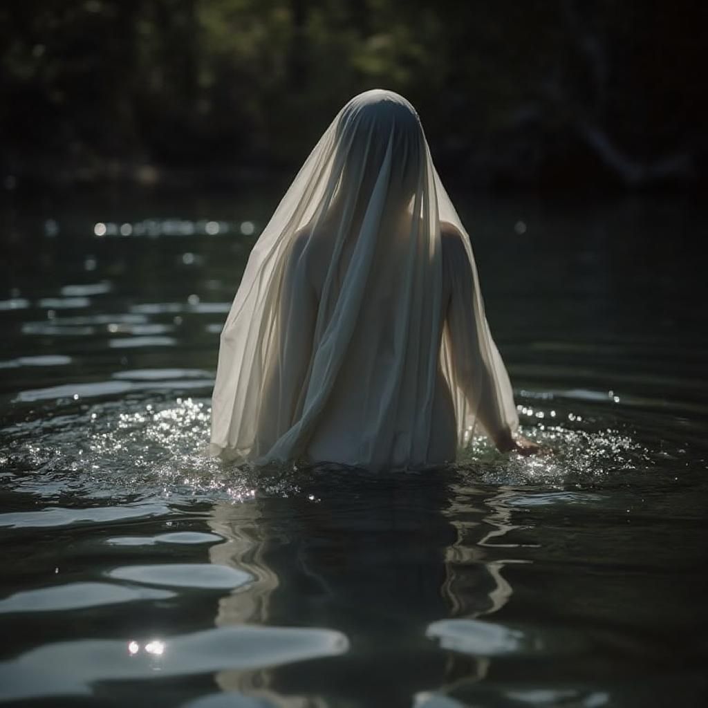 Shot Type: Medium Shot. The camera is positioned at water level, capturing the figure from the waist up as it emerges from the lake. This perspective emphasizes the transition between water and air, creating a sense of mystery and emergence. Composition Techniques: Rule of Thirds, Leading Lines. The veiled figure is placed slightly off-center, adhering to the rule of thirds. The ripples in the water act as leading lines, drawing the viewer's eye towards the central subject. The vertical lines of the figure contrast with the horizontal planes of the water surface, creating visual interest. Lighting: The scene is characterized by low-key lighting, with the white-veiled figure serving as the primary light source. This creates a stark contrast against the darker water and shadowy background. The soft, diffused light on the veil suggests an internal glow, enhancing the ethereal quality of the image. The water's surface reflects and refracts this light, creating a subtle shimmer that adds depth to the scene. Color Palette: The color scheme is dominated by cool tones. The white of the veil stands out against the deep blues and blacks of the water and surrounding forest. Hints of green from the reflected foliage add a subtle natural element to the palette. The monochromatic nature of the figure accentuates its otherworldly presence. Mood and Emotion: The scene evokes a sense of mystery, serenity, and slight unease. The calm water surface contrasts with the emergence of the figure, creating a tension between tranquility and the unknown. There's a melancholic beauty to the image, suggesting themes of rebirth, transition, or the supernatural. Style: The image blends elements of surrealism with photorealistic detail. While the setting appears natural, the presence of the veiled figure introduces a dreamlike quality. The high level of detail in the fabric's texture and water ripples grounds the surreal element in a tangible reality. Location and Setting: The scene takes place in a secluded lake or pond, likely within a forest. The water's surface is calm, disturbed only by the figure's presence. The background hints at dense vegetation, creating a sense of isolation and intimacy. The lack of visible shoreline enhances the feeling of being suspended in a liminal space. Character Placement: The veiled figure is centrally positioned, emerging from the water at a slight angle. Only the upper body is visible, with arms partially submerged. The veil drapes over the entire form, obscuring any identifiable features but hinting at a human shape beneath. The figure's posture suggests a slow, deliberate movement upward and slightly forward, as if rising from the depths. The veil itself is a key element, appearing almost translucent yet concealing. Its folds and drapes create a complex interplay of light and shadow, emphasizing the figure's mysterious nature. The fabric seems to meld with the water at its edges, blurring the line between the figure and its environment. The water interacts intimately with the figure, forming concentric ripples that expand outward. These ripples are most pronounced near the figure's body and gradually diminish towards the edges of the frame, emphasizing the figure's impact on its surroundings. Every fold of the veil, every ripple in the water, and every shadowy reflection contributes to the image's haunting beauty. The scene captures a moment of transition, a threshold between worlds, inviting the viewer to contemplate the mysteries that lie beneath the surface of both the water and reality itself.