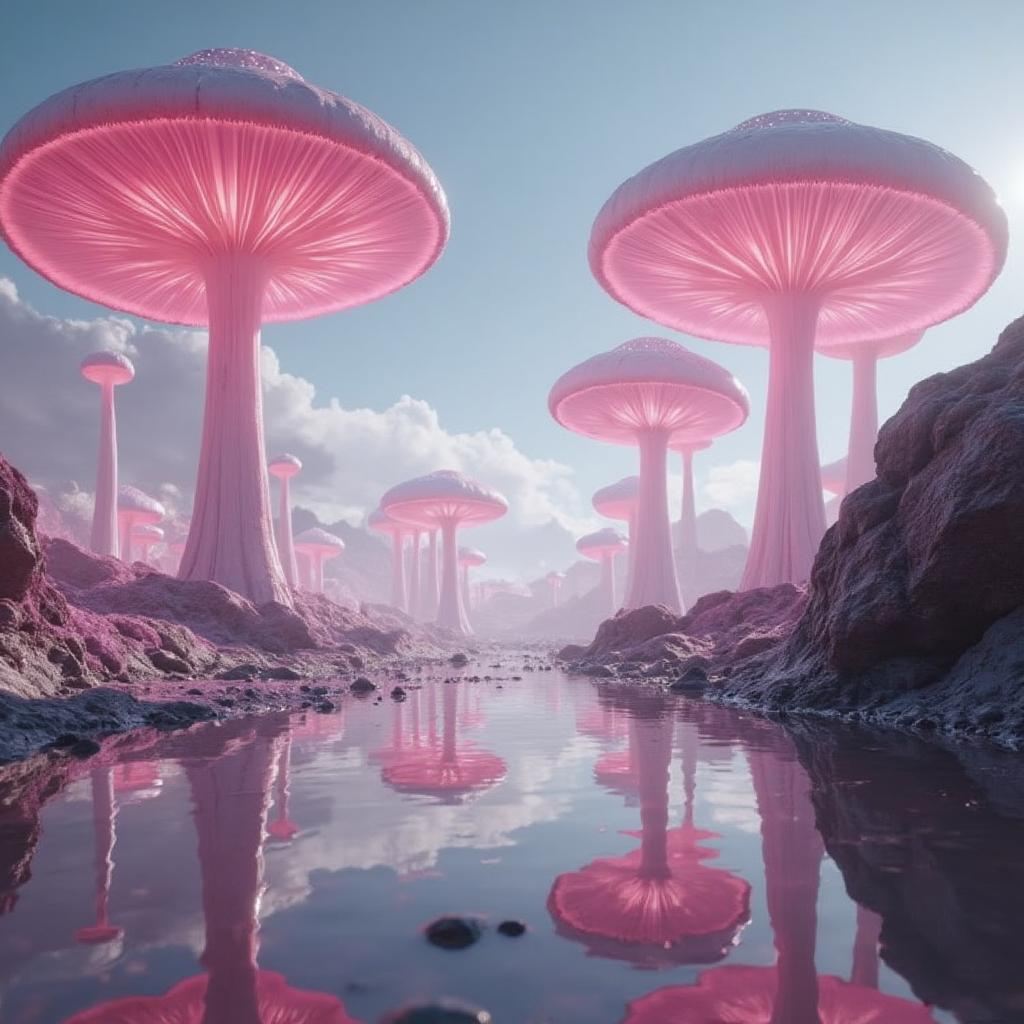 Towering pink mushrooms dominate a surreal landscape, their translucent caps glowing against a blue sky. The scene is reflected in a still pool, creating a mirror image of this alien world. Rocky outcrops and smaller fungi populate the foreground, adding depth and scale to this dreamlike environment.