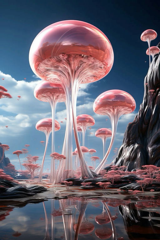 Shot Type: Extreme Wide Shot. The camera is positioned low to the ground, capturing the full height of the enormous mushroom structures and the vastness of the alien landscape. This perspective emphasizes the monumental scale of the scene and immerses the viewer in this otherworldly environment. Composition Techniques: Leading Lines, Depth of Field, Foreground Interest. The tall stems of the mushrooms create strong vertical lines that guide the eye upward, while the reflective pool in the foreground adds depth and creates a sense of symmetry. The rocky outcrops on the right provide foreground interest and frame the scene. Lighting: The lighting in this scene is soft and diffuse, suggesting an overcast sky or atmospheric haze. The pink mushrooms appear to be bioluminescent, emitting a gentle glow that contrasts with the blue sky. This creates a dreamlike quality and enhances the alien nature of the landscape. The light interacts with the translucent caps of the mushrooms, giving them a glass-like appearance and creating subtle shadows beneath. Color Palette: The dominant colors are pink and blue, creating a striking contrast. The pink ranges from pale, almost white tones in the mushroom stems to deeper, more saturated hues in the caps. The sky is a clear, cerulean blue, while the rocky elements introduce shades of gray and black. Hints of white in the clouds and reflections add brightness to the scene. Mood and Emotion: The scene evokes a sense of wonder, serenity, and curiosity. The surreal nature of the landscape creates a dreamlike atmosphere that is both calming and slightly unsettling. The soft lighting and reflective pool contribute to a peaceful mood, while the alien forms of the mushrooms inspire a sense of awe and exploration. Style: The image combines elements of surrealism and hyper-realism. While the subject matter is clearly fantastical, the rendering of textures, lighting, and reflections is highly detailed and naturalistic. This creates a captivating juxtaposition between the familiar (realistic rendering) and the unfamiliar (alien landscape). Location and Setting: The setting is an alien planet or a fantastical realm. The landscape is dominated by enormous, bioluminescent mushroom-like structures that tower over the terrain. These fungi have smooth, translucent caps that glow with an inner pink light, supported by tall, slender stems. The ground is rocky and uneven, with smaller mushrooms and plant-like growths scattered throughout. A still pool of water in the foreground creates a perfect reflection of the scene, doubling the visual impact of the mushroom forest. In the background, a rocky cliff face can be seen, suggesting a varied and expansive terrain beyond the visible area. The image is rich in fine details that add to its realism despite the fantastical subject matter. The mushroom caps have a slightly mottled texture, with variations in color and translucency that suggest complex internal structures. The stems have a smooth, almost porcelain-like quality, with subtle gradients of color from base to cap. The rocky ground is intricately textured, with cracks, crevices, and small protrusions that create a sense of geological authenticity. The water in the foreground is exceptionally still, creating a mirror-like surface that perfectly reflects the sky and mushrooms. This reflection adds depth to the composition and creates a sense of symmetry that draws the eye. Small ripples or disturbances in the water's surface would add to the realism of the scene. In the sky, wispy clouds can be seen, adding texture and depth to the blue expanse. These clouds are reflected in the water, further enhancing the scene's realism. The interaction of light with the atmosphere creates a subtle haze that softens the distant elements of the landscape, adding to the sense of depth and scale. Throughout the scene, there are smaller details that a storyboard artist should note: tiny, pink spore-like particles floating in the air, adding movement and life to the still landscape; intricate patterns of light and shadow on the ground, created by the overlapping mushroom caps; and subtle variations in the terrain, such as small rocks, cracks, or patches of different textures that break up the uniformity of the ground. The overall effect is a highly detailed, immersive environment that, while clearly alien and fantastical, is rendered with enough realism to make it feel tangible and believable. Every element, from the grand scale of the mushroom structures to the tiniest details of texture and light, contributes to creating a cohesive and captivating alien world.