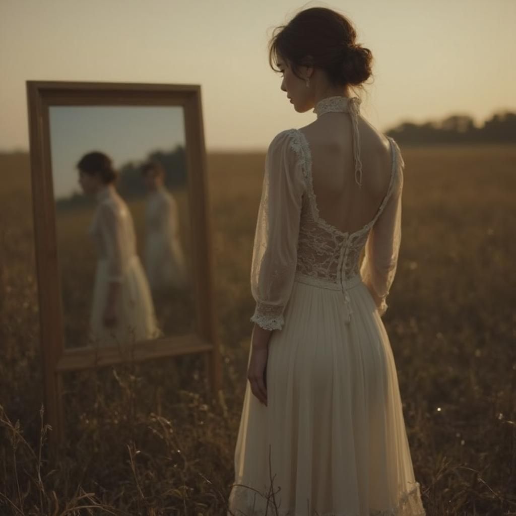 Shot Type: Medium Shot with elements of a Wide Shot in the reflection. The camera is positioned to capture the upper body of the main figure in the foreground, while also showing the full-body reflections in the mirror. Composition Techniques: The image employs Rule of Thirds, with the main figure occupying the left third of the frame. There's a strong use of Framing, with the mirror creating a secondary scene within the main image. The composition creates a sense of Depth of Field, with the foreground figure sharp and the background slightly blurred. Lighting: The scene is bathed in soft, warm twilight lighting, creating a golden hour effect. The main light source appears to be coming from the right side of the frame, casting a gentle glow on the figure's white dress and creating subtle shadows. The lighting in the mirror reflection is slightly different, emphasizing the surreal nature of the image. Color Palette: The dominant colors are Beige and Brown in the background sky, White for the dress, and Green for the field in the reflection. There's a subtle Blue tint in the mirror's frame, adding to the ethereal quality. Mood and Emotion: The image evokes a sense of Melancholic and Serene emotions. There's a feeling of nostalgia and contemplation, enhanced by the vintage aesthetic and the juxtaposition of the solitary figure with the group in the reflection. Style: The image blends elements of Surrealism with a Cinematic approach. The vintage look and dreamy quality give it an Impressionistic feel as well. Location and Setting: The scene takes place in an open field at twilight. The foreground shows dry, tall grass, while the background reveals a treeline silhouette. The sky has a gradient from darker at the top to lighter near the horizon, typical of the golden hour. Character Placement: The main figure stands in the left third of the frame, facing right. Only the body from the neck down is visible, wearing a high-necked, long-sleeved white dress with intricate lace details. The figure's right hand is holding a rectangular mirror at waist height. In the mirror's reflection, we see three smaller figures standing in a field. They appear to be women in vintage dresses, positioned as if walking or standing together. This creates a striking contrast between the solitary main figure and the group in the reflection. The mirror itself is a key element, acting as a portal or window into another time or place. Its frame is barely visible, emphasizing the seamless transition between the two realities. The image has a slightly grainy, film-like quality, enhancing its vintage and dreamlike atmosphere. The focus is soft overall, contributing to the ethereal feel of the scene. The composition creates a visual narrative, suggesting themes of memory, time, and reflection. The contrast between the solitary figure and the group in the mirror invites contemplation about past and present, isolation and connection.
