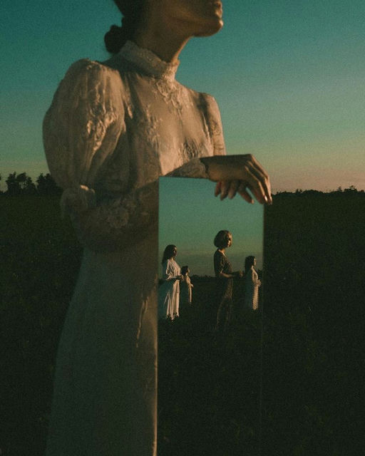Dreamscape, Ethereal, Field, Memory, Mirror, Nostalgia, Reflection, Surrealism, Time, Twilight, Vintage, White dress