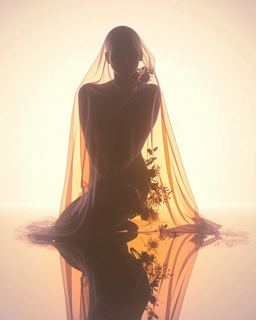 Shot Type: Medium Shot. The camera is positioned directly in front of the subject, capturing the entire silhouetted figure from head to knee. The framing is tight enough to emphasize the subject's form while allowing space for the veil to gracefully fall around them. Composition Techniques: Rule of Thirds, Symmetry, Depth of Field. The figure is centrally placed, creating a symmetrical composition that draws the eye immediately to the subject. The veil and floral elements add depth, extending beyond the frame and suggesting a larger environment. Lighting: The scene is dominated by strong backlighting, likely representing a sunset or 'golden hour' light. This creates a warm, golden glow that outlines the figure's silhouette and illuminates the translucent veil. The light source appears to be just above and behind the subject, casting long, soft shadows and giving the entire image a dreamy, ethereal quality. Color Palette: The color scheme is warm and muted, dominated by golden yellows, soft oranges, and hints of pink. These warm tones contrast beautifully with the dark silhouette of the figure, creating a striking visual effect. The background fades to a pale, creamy color at the edges, enhancing the dreamy atmosphere. Mood and Emotion: The image evokes a sense of Serenity, Mystery, and Melancholy. The graceful pose of the figure and the soft, glowing light create a calm, peaceful atmosphere. However, the obscured features of the subject add an element of intrigue and unknowability. Style: The image blends elements of Minimalism and Surrealism. The clean, simple silhouette and uncluttered composition speak to a minimalist approach, while the ethereal lighting and dreamlike quality of the veil and flowers introduce a surrealist touch. Location and Setting: The setting appears to be an abstract, undefined space. The lack of distinct background elements focuses all attention on the subject and the interplay of light and fabric. This could represent an interior studio setup with carefully controlled lighting, or it could be a highly stylized representation of an outdoor scene at sunset. Character Placement: The silhouetted figure kneels centrally in the frame, facing directly towards the camera. Their posture is graceful and poised, with arms relaxed at their sides. The veil drapes over their head and shoulders, falling in soft folds around their body. Delicate floral elements are artfully arranged around the figure, some appearing to float or be suspended in the air, adding to the surreal quality of the image. The veil is a key element of the composition. It's sheer enough to allow light to pass through, creating a soft, glowing outline around the figure's head and shoulders. The fabric appears to be very fine and lightweight, as evidenced by its flowing, gossamer-like quality. It extends beyond the frame at the top, suggesting continuation and adding to the sense of ethereal beauty. The floral elements are strategically placed to frame the figure. They appear to be wildflowers or delicate branches with small blooms. These elements are also silhouetted, creating intricate shapes and adding visual interest to the negative space around the subject. Some flowers are positioned near the figure's shoulder and others seem to float around the lower part of the image, contributing to the dreamy, surreal atmosphere. The reflective surface beneath the figure adds another layer of visual intrigue. It mirrors the silhouette and the falling fabric, creating a sense of depth and grounding the ethereal scene. This reflection enhances the overall symmetry of the composition and adds a subtle touch of realism to the otherwise dreamlike image. Every aspect of this image, from the precise positioning of the figure to the careful arrangement of light and shadow, contributes to a powerful, emotive scene that blends reality with fantasy, inviting the viewer into a world of mystery and beauty.