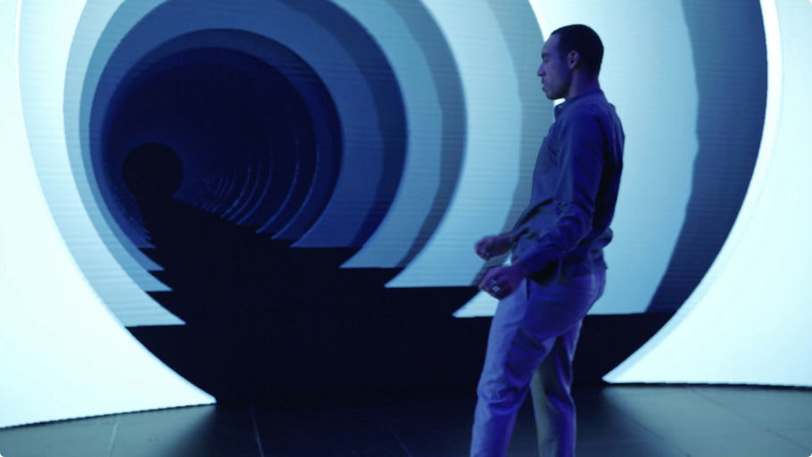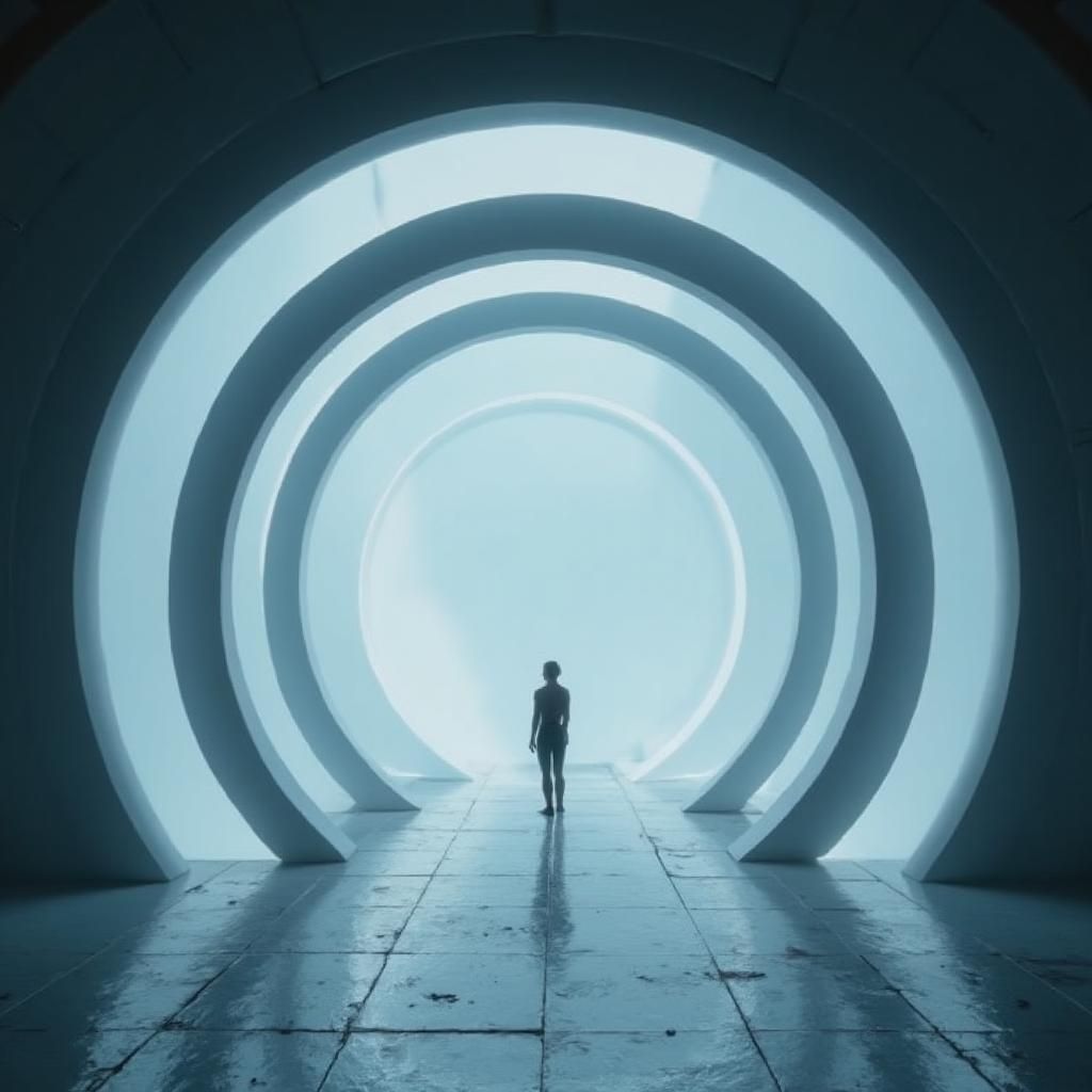 A solitary figure stands before a massive circular portal, bathed in cool blue light. The sleek, minimalist environment suggests an advanced technological setting. The curved lines of the structure draw the eye into a seemingly endless tunnel, creating a sense of mystery and anticipation. The scene exudes a calm yet slightly tense atmosphere, hinting at the threshold of a momentous journey.