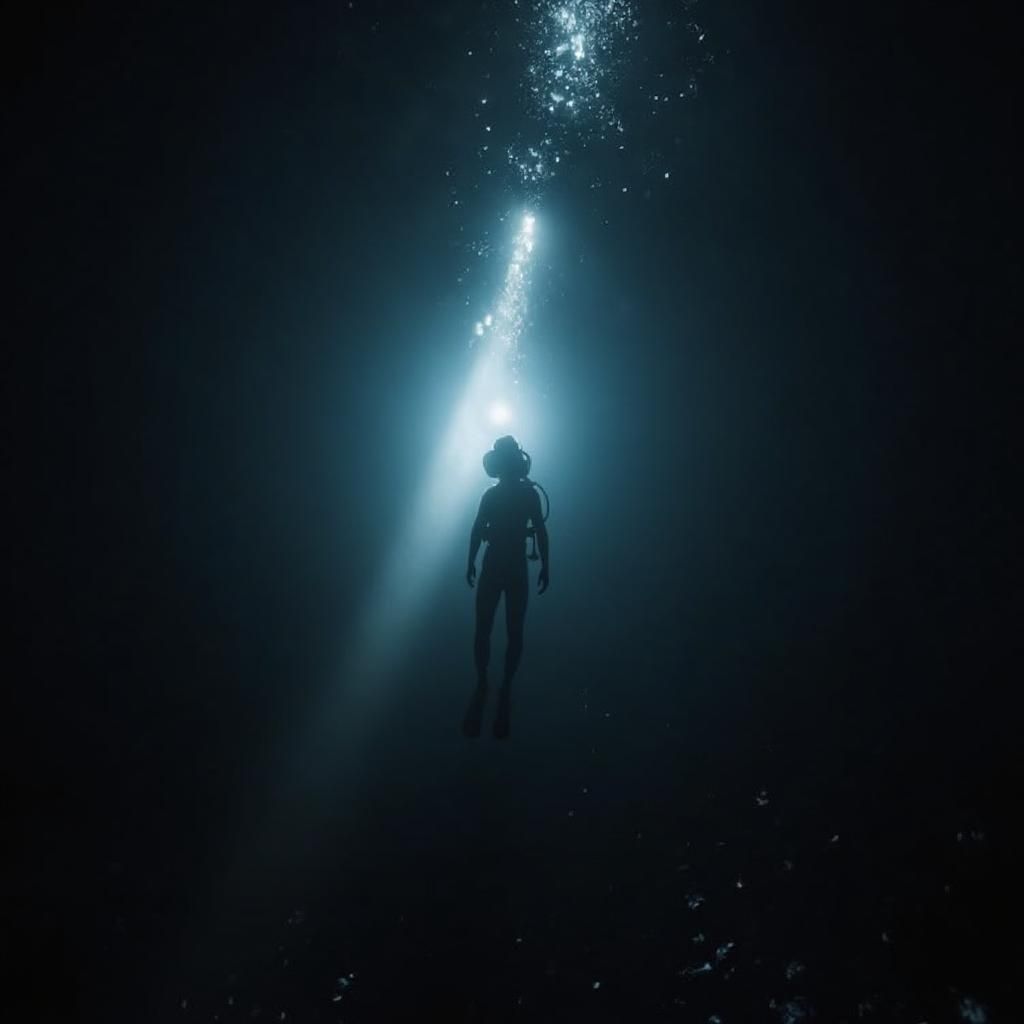 A haunting underwater scene unfolds as a figure emerges from the murky depths, illuminated by an ethereal glow. The dark, turbulent waters contrast sharply with the brilliant light source, creating a mesmerizing interplay of shadow and radiance. This captivating moment evokes a sense of mystery and discovery in the vast, unexplored ocean realm.