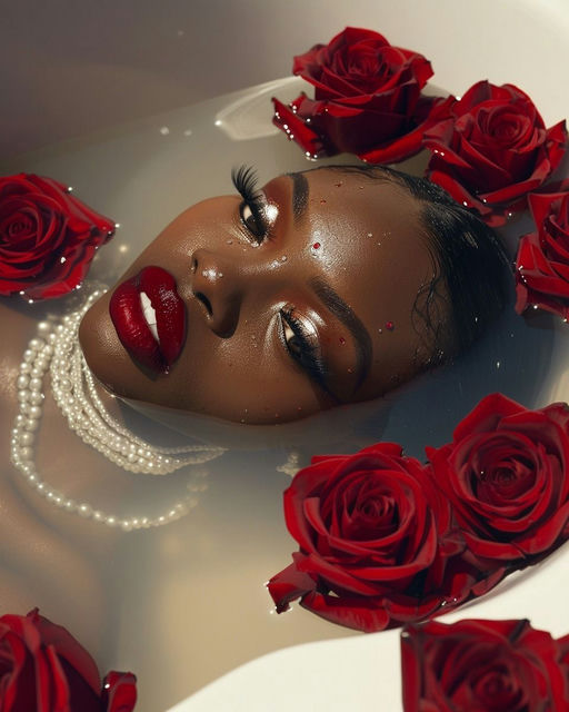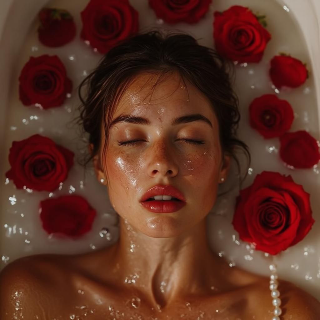 "Extreme Close-Up shot of a woman in a luxurious bath, viewed from directly above, capturing her serene face amidst a sea of red roses. The composition follows the Rule of Thirds, with her face occupying the lower two-thirds and roses framing the edges, enhancing symmetry. Soft, diffused warm lighting from above casts a gentle shimmer on the milky water’s surface, accentuating dewdrops on her flawless skin. The color palette features deep reds from the roses, rich browns of her skin, creamy whites of the bath water, and iridescent gold accents in her makeup and light reflections. The scene exudes luxury, sensuality, and calm, portraying a moment of indulgence and self-care. Hyper-realistic style creates vivid details with a touch of surrealism, perfect for a high-fashion editorial look. The setting is a high-end bathroom, with rose petals and whole roses floating on the water and a string of pearls partially submerged, draping from the lower left corner. The woman's tilted head, closed eyes, and deep red lips mirror the roses, while glitter particles and small water droplets enhance the luxurious atmosphere. Every element is carefully arranged, resulting in a visually stunning and emotionally rich image."