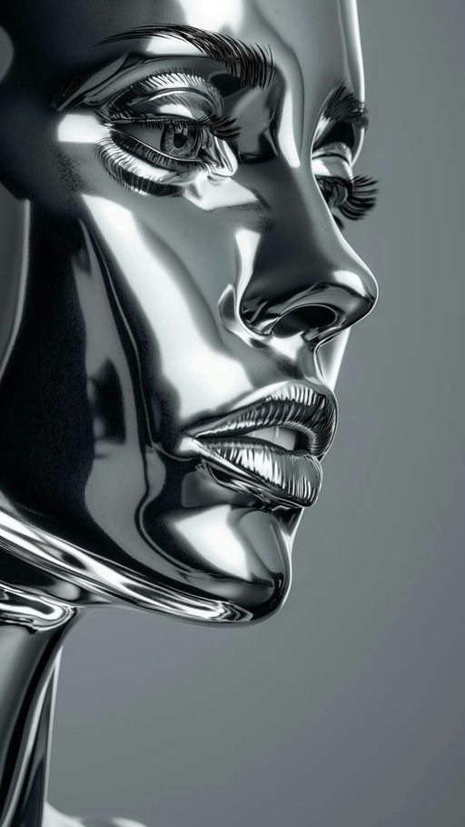 Textural Details: The surface of the face exhibits varying degrees of reflectivity. Areas like the cheekbone and forehead appear smoother and more mirror-like, while regions around the eyes and lips show more complex textures, mimicking the intricacies of human facial features. Faint, almost imperceptible seams hint at the constructed nature of the face, blurring the line between organic and manufactured.