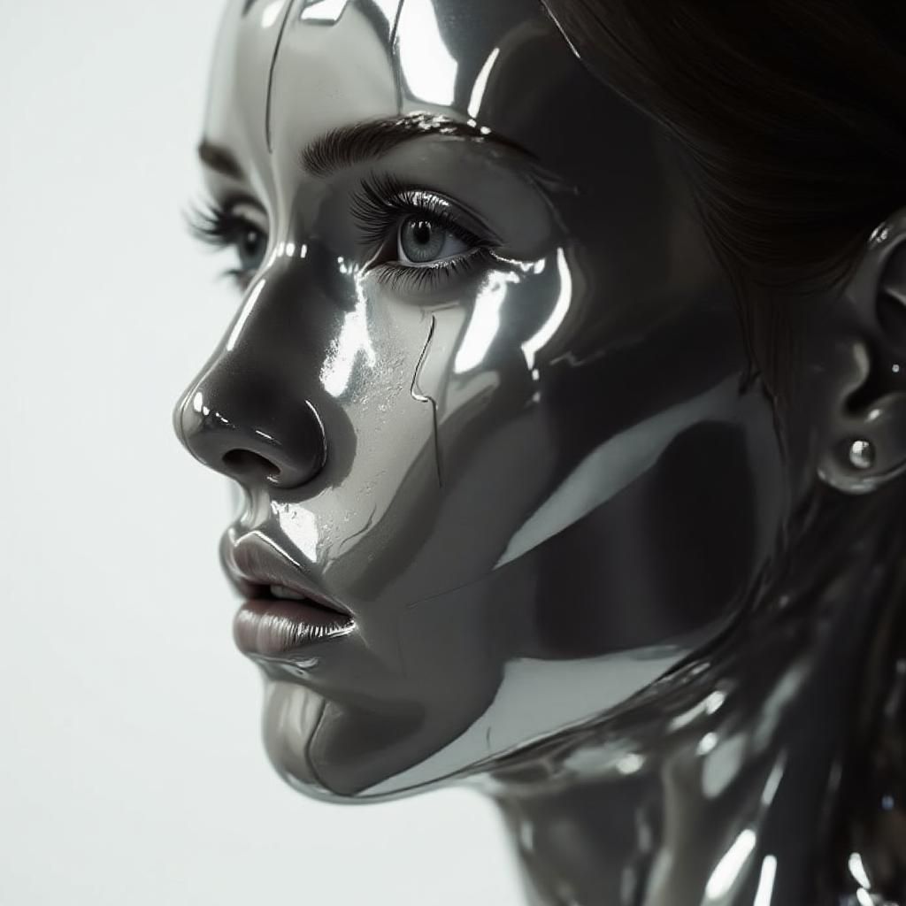 "Shot Type: Extreme Close-Up. The camera is positioned at a slight angle, capturing the left side of a metallic humanoid face in intricate detail. The perspective emphasizes the curvature of the cheek, the sharp line of the jaw, and the subtle depth of the eye socket. Composition Techniques: Rule of Thirds, Leading Lines. The eye is placed near the upper-left intersection point of the rule of thirds grid, drawing immediate attention. The contours of the face create natural leading lines that guide the viewer's gaze across the image, from the eye down to the lips and along the jawline. Lighting: High-contrast directional lighting from the upper left casts dramatic shadows across the face, accentuating its metallic nature. Specular highlights on the cheekbone, nose bridge, and lips create a sense of depth and texture, emphasizing the reflective quality of the material. Color Palette: The image is predominantly rendered in shades of silver and gray, with darker charcoal tones in the shadows and brilliant white highlights where light directly strikes the surface. This monochromatic scheme reinforces the artificial, technological nature of the subject. Mood and Emotion: The mood is simultaneously serene and slightly unsettling. The perfection of the metallic face evokes a sense of awe, while its lifeless nature creates an undercurrent of unease. The expressionless features and reflective surface invite contemplation on the nature of consciousness and artificial intelligence. Style: Hyper-realistic. Every detail of the metallic surface is rendered with exceptional clarity, from the fine lines mimicking eyelashes to the subtle variations in the reflective properties of different facial features. The style blends photorealistic precision with a futuristic aesthetic. Location and Setting: The setting appears to be a controlled environment, possibly a high-tech laboratory or studio. The neutral background focuses all attention on the subject, emphasizing its otherworldly nature. Character Placement: The metallic face occupies most of the frame, slightly angled to showcase the left side. The eye is fully visible, with long, metallic lashes adding a touch of organic mimicry. The nose is partially visible, leading down to parted lips that suggest a moment frozen in time, perhaps on the verge of speech. The jawline extends beyond the frame, implying continuation and larger scale. Textural Details: The surface of the face exhibits varying degrees of reflectivity. Areas like the cheekbone and forehead appear smoother and more mirror-like, while regions around the eyes and lips show more complex textures, mimicking the intricacies of human facial features. Faint, almost imperceptible seams hint at the constructed nature of the face, blurring the line between organic and manufactured. Eye Detail: The visible eye is a masterpiece of biomimetic engineering. The iris displays a complex pattern of metallic filaments, creating an illusion of depth and intelligence. The pupil, a darker recess, seems to absorb light rather than reflect it, adding to the sense of an observant, possibly sentient being. Lip Configuration: The parted lips reveal a glimpse of the interior, which maintains the same metallic composition as the exterior. This detail reinforces the artificial nature of the subject while simultaneously evoking a sense of potential speech or expression. Overall Impact: The image serves as a powerful exploration of the uncanny valley, presenting a subject that is clearly artificial yet unsettlingly close to human. It challenges viewers to contemplate the future of AI and robotics, the nature of consciousness, and the blurring lines between human and machine in an increasingly technological world."
