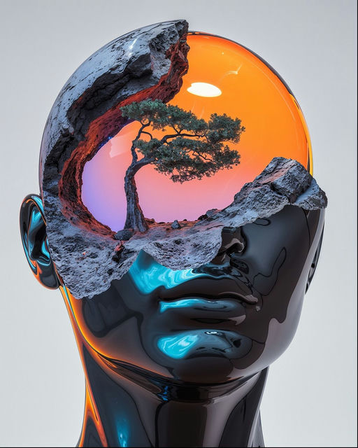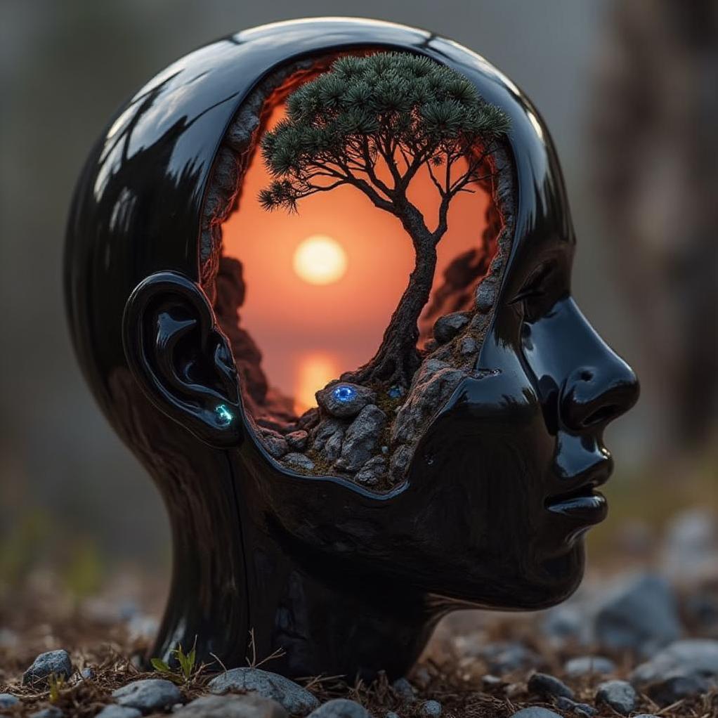 Shot Type: Extreme Close-Up. The camera is positioned directly in front of a stylized black head sculpture, capturing it from just below eye level. The head fills most of the frame, with the top slightly cropped. Composition Techniques: Rule of Thirds, Asymmetry, Depth of Field. The tree within the head is positioned along the right third line, creating visual interest. The asymmetrical placement of the rock formations and tree adds dynamism. Shallow depth of field emphasizes the foreground elements while softening the background. Lighting: The scene features dramatic lighting with multiple sources. The interior of the head is illuminated by a warm, orange glow that transitions to pink, suggesting a sunset or dawn sky. This warm light contrasts sharply with the cool, electric blue emanating from the eye socket and ear. The exterior of the head is mostly in shadow, with slight reflections hinting at an external light source. Color Palette: The dominant colors are Black, Orange, Pink, Blue, and Gray. The black of the head's exterior provides a stark canvas for the vivid interior colors. The warm oranges and pinks create a surreal, dreamlike atmosphere inside the head. Cool blue accents add an otherworldly, technological feel. Gray rock textures add natural elements and depth. Mood and Emotion: The scene evokes a sense of Wonder, Serenity, and Intrigue. The juxtaposition of natural and artificial elements creates a contemplative atmosphere, inviting the viewer to ponder the relationship between nature and technology. Style: The image blends Surrealism with Hyper-realism. The concept is decidedly surreal, with a tree growing inside a head. However, the execution is highly detailed and photorealistic, particularly in the textures of the rock and tree. Location and Setting: The setting is a digital realm where reality bends. The interior of the head contains a miniature landscape with a gnarled tree growing from a rocky cliff. The tree appears to be a pine or cypress, with twisted branches reaching towards an unseen sky. The rocks are textured and weathered, suggesting an ancient, windswept location. Character Placement: While there are no human characters, the head itself serves as a central figure. Its sleek, black exterior contrasts with the vibrant, natural scene within. The tree inside acts as a focal point, its branches reaching up and to the right, guiding the viewer's eye. The rock formations inside the head are intricately detailed, with cracks, crevices, and a rough texture that contrasts with the smooth exterior. The tree bark is similarly detailed, with visible knots and a gnarled structure that speaks to its resilience in a harsh environment. The transition between the exterior and interior of the head is abrupt and clean, emphasizing the divide between the technological and natural worlds. The edge where the black exterior meets the glowing interior is sharp and precise, almost as if the head has been sliced open to reveal its contents. The blue glow emanating from the eye socket and ear is not uniform but has a liquid-like quality, suggesting movement or energy. This blue light interacts with the edges of the head, creating a subtle rim lighting effect that further separates the head from the background. The background is a neutral gray, allowing the head to stand out prominently. This simplicity in the background puts all focus on the complex interplay of elements within and around the head sculpture. The overall composition creates a sense of depth, with the foreground elements (the black exterior of the head) leading into the middle ground (the tree and rocks) and finally to the background (the glowing orange and pink 'sky' within the head). The image is rendered with exceptional clarity and detail, suggesting high-resolution 3D modeling and rendering techniques. Every element, from the fine branches of the tree to the subtle reflections on the black surface of the head, is crafted with precision to create a hyper-realistic yet surreal scene.