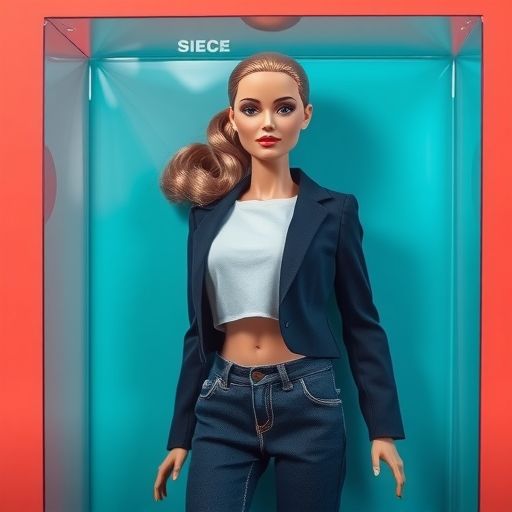Shot Type: Medium Shot positioned at eye level with the packaged fashion doll, creating direct engagement with the product while maintaining professional distance for commercial presentation. Camera positioned perpendicular to the package face for optimal product visibility. Composition Techniques: Rule of thirds places the doll's face in the upper third intersection, while symmetry creates balanced left-right composition within the rectangular package frame. The clear plastic clamshell creates natural framing around the subject. Lighting: Soft, even commercial lighting eliminates harsh shadows while maintaining crisp detail definition. The lighting appears to be studio-quality with controlled ambient sources, creating subtle highlights on the plastic packaging and fabric textures of the clothing. No dramatic shadows, ensuring clean product visibility. Color Palette: Dominant turquoise background transitions smoothly into coral/orange gradients, creating vibrant contrast against the navy blue business suit. White crop top provides neutral balance, while beige skin tones add warmth. The clear plastic packaging maintains color purity without distortion. Mood and Emotion: Neutral to slightly excited emotional tone appropriate for aspirational consumer products. The presentation suggests quality and desirability without being overwhelming. Style: Pop Art aesthetic combined with commercial product photography, featuring bold colors and clean lines typical of contemporary retail design. The style is hyper-realistic in product representation while maintaining artistic appeal. Location and Setting: Professional product photography studio environment with controlled gradient background, designed for retail catalog or promotional materials. The setting suggests premium collectible market positioning. Character Placement: The fashion doll is centered within the clear plastic clamshell packaging, positioned upright with arms at sides, facing directly forward. The figure wears a navy blue blazer over a white crop top with matching navy bottoms, hair styled in a sleek pulled-back look with small earrings visible.