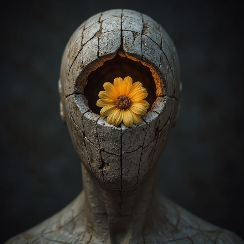 A haunting surrealist image depicts a stone-like humanoid bust with a cavernous opening in its head. Inside, a delicate yellow flower sprouts from barren ground, illuminated by an ethereal glow. The contrast between the harsh, weathered exterior and the fragile life within creates a powerful visual metaphor for resilience and inner growth.