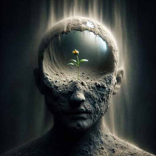 Shot Type: Extreme Close-Up. The camera is positioned directly in front of the subject, capturing the entirety of the stone-like bust from the neck up. The frame is tightly focused on the head, emphasizing the cavernous opening and the flower within. Composition Techniques: Rule of Thirds, Symmetry, Depth of Field. The bust is centered vertically, occupying the full height of the frame. The opening in the head follows the rule of thirds, positioned slightly above center. The flower is placed precisely in the center of the opening, creating a symmetrical focal point. The depth of field is deep, with both the textured exterior and the interior cavity in sharp focus. Lighting: The lighting is dramatic and ethereal. A soft, diffused glow emanates from within the head cavity, illuminating the flower and creating a stark contrast with the darker, textured exterior of the bust. Rim lighting along the edges of the bust separates it from the dark background, enhancing the three-dimensional quality. The light within the cavity has a cool, bluish tint, while the exterior is lit with warmer tones, accentuating the difference between inner and outer worlds. Color Palette: The dominant colors are shades of gray and brown for the weathered, stone-like exterior of the bust. The interior cavity features a gradient from cool blue-gray at the edges to a warmer, golden glow around the flower. The flower itself is a vibrant yellow, standing out as the only saturated color in the image. The background is a deep, desaturated blue-gray, fading to near-black at the edges. Mood and Emotion: The image evokes a complex mix of emotions: melancholy from the weathered, lifeless exterior; hope and resilience symbolized by the delicate flower; and a sense of wonder and introspection created by the surreal juxtaposition of elements. There's an underlying tension between decay and rebirth, hardness and softness, darkness and light. Style: The image is rendered in a hyper-realistic surrealist style. The textures of the stone-like bust are intricately detailed, with every crevice, pore, and imperfection visible. The flower is depicted with botanical accuracy, from the curve of its stem to the delicate petals. Despite the fantastic nature of the scene, each element is rendered with photographic precision, enhancing the surreal quality by making the impossible seem tangible. Location and Setting: The setting is abstract and undefined, focusing entirely on the bust against a dark, ambiguous background. This void-like space emphasizes the internal nature of the scene, suggesting a mindscape rather than a physical location. The lack of context forces the viewer to confront the symbolic elements without distraction. Character Placement: The stone-like bust occupies the entire frame, facing directly toward the viewer. Its expression is neutral, almost meditative, with closed eyes and slightly parted lips. The rough, cracked texture of the skin contrasts sharply with the smooth, hollowed-out cavity of the head. Within this opening, the ground is barren and moon-like, with a single flower sprouting from its center. The flower's stem rises straight up, its bloom tilted slightly towards an unseen light source, embodying hope and perseverance in harsh conditions.