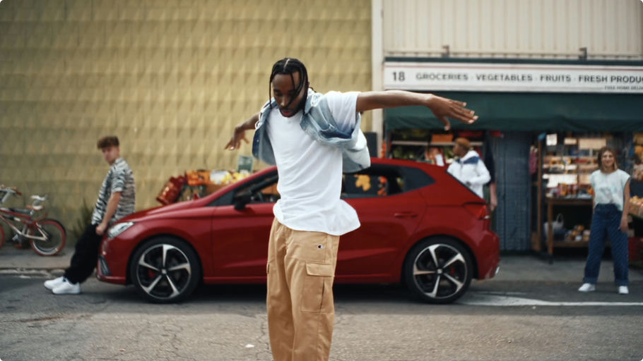 Dynamic medium shot, vibrant urban life, spontaneous expression. Rule of thirds, dancer off-center, energy and joy. Background: striking red sports car, bustling grocery store, context and depth. Natural lighting, playful shadows, dancer’s movement. Rich color palette: warm dancer’s outfit, bold red car, cooler building hues. Mood: excitement, youthful exuberance. Realistic yet cinematic style, documentary feel, authenticity of city moment.