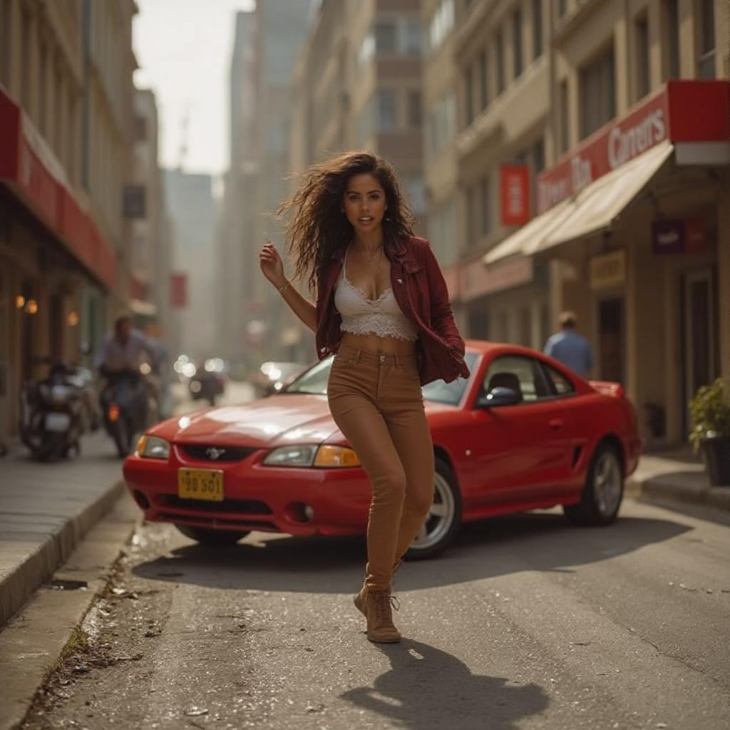 "Create a dynamic medium shot that encapsulates a vibrant slice of urban life, highlighting spontaneous expression. The scene is framed using the rule of thirds, with a lively dancer positioned off-center, radiating energy and joy. In the background, include a striking red sports car parked alongside a bustling grocery store, contributing layers of context and depth to the environment. Utilize natural lighting to accentuate the raw, unfiltered essence of the moment, casting playful shadows that enhance the dancer's movement. The color palette should be rich, featuring warm tones from the dancer’s colorful outfit juxtaposed against the bold red of the car, while the cooler hues of the surrounding building facades provide a pleasant contrast. Infuse the image with an overall mood of excitement and youthful exuberance, capturing the spirit of urban vitality. The artistic style should be realistic yet possess a cinematic quality, evoking a documentary feel that emphasizes the authenticity of the city moment."